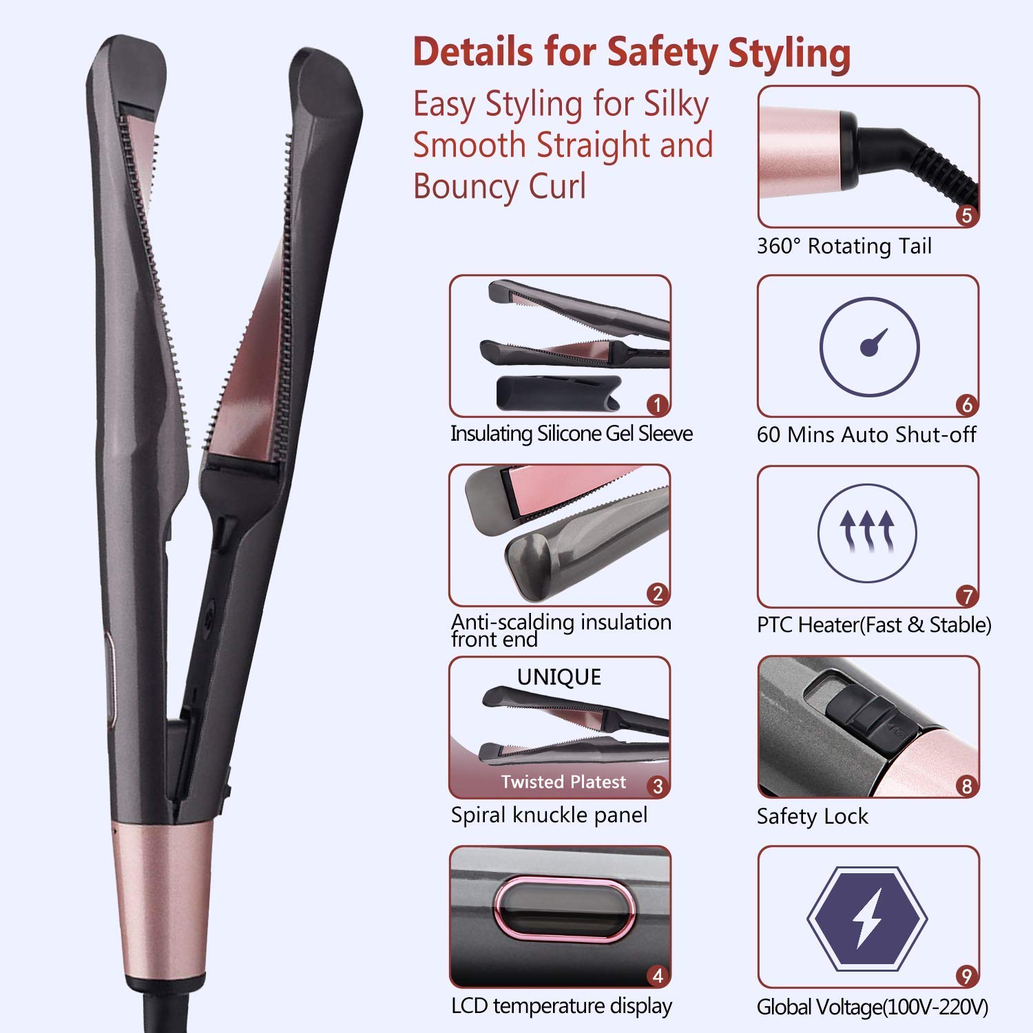 • 30 Seconds Fast Heating: Unique Twisted Heat Plates that help to move smoothly and eliminate frizz to give you more control when styling. 110-240 V Dual Voltage: This hair straightener is globally versatile